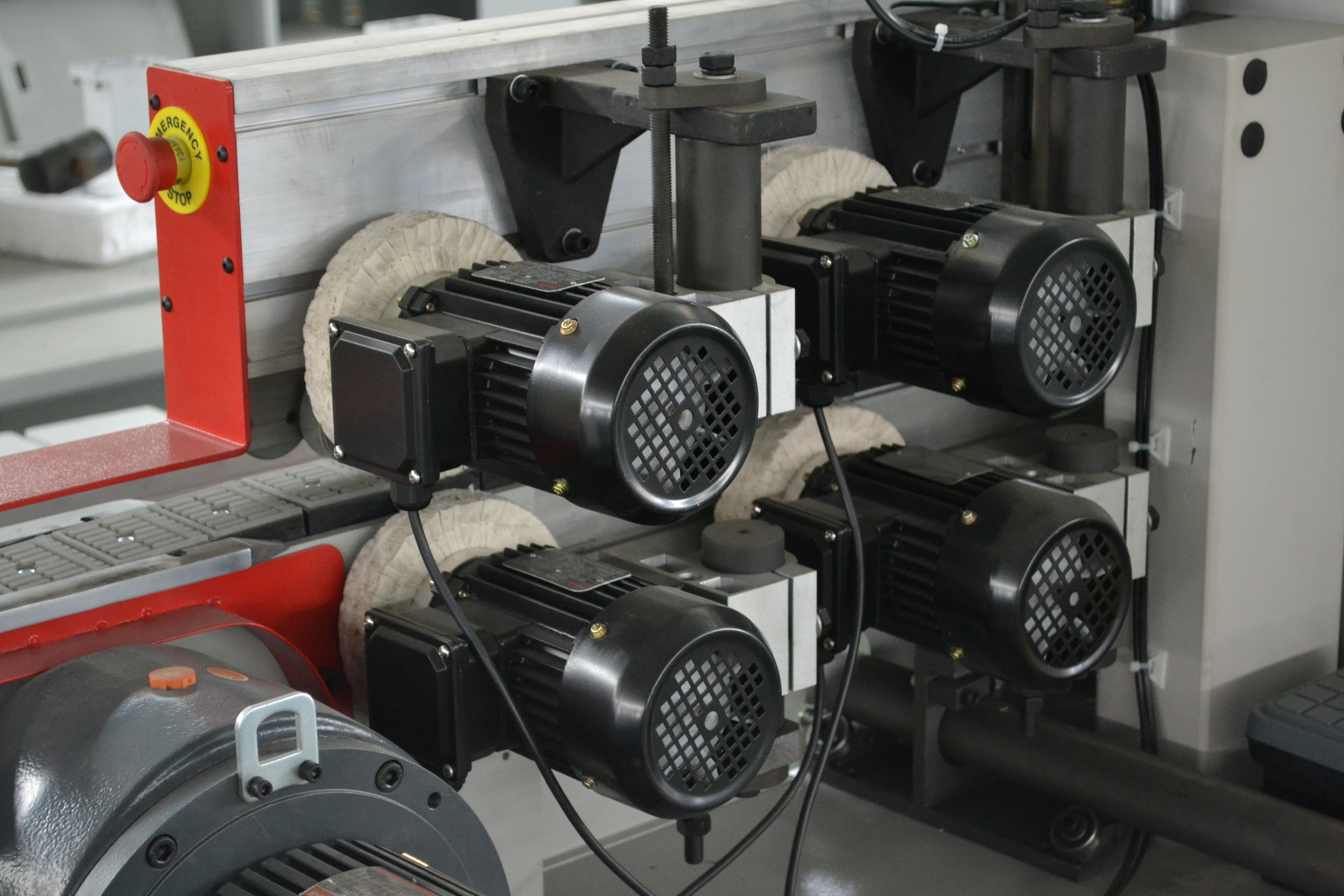* 8 Functions: Pre-milling--Gluing--End Cutting--Rough Trimming--Fine Trimming--Corner Rounding--Scraping--Buffing * Working Voltage: 380V/50HZ /3PH * DELTA inverter or MCGS inverter for your choice. * PLC Touch Screen * CC highspeed motor. * The conveyor speed can be adjusted from 13-25m/min *Honeywell travel switch. *Air Tac solenoid valve, air cylinder,oil-water seperator. * With automatic oil feeder. *14mm high strenth steel sheet for the whole machine. * In the machine is mounted lights. * Support customization for the machine appearance.