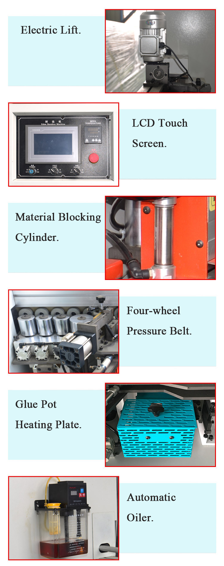 * 5 Functions: Gluing--End Cutting--Fine Trimming--Scraping--Buffing * Working Voltage: 380V/50HZ /3PH * MCGS inverter. * PLC Touch Screen * CC highspeed motor. *Honeywell travel switch, contactor, air switch. *Air Tac solenoid valve, air cylinder,oil-water seperator. * With automatic oil feeder. *14mm high strenth steel sheet for the whole machine. * In the machine is mounted lights. * Support customization for the machine appearance.